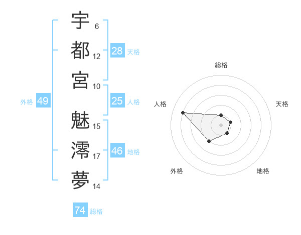 宇都宮 魅澪夢さんの総格は74画の1点!
