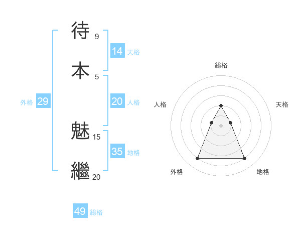 待本 魅繼さんの総格は49画の2点!