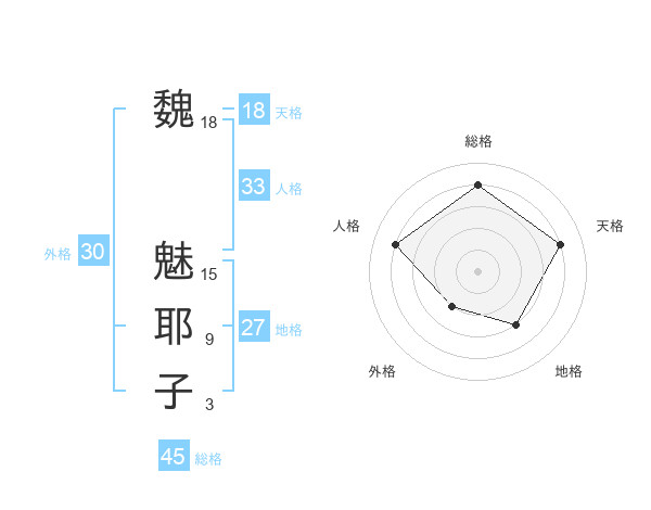 魏 魅耶子さんの総格は45画の4点!
