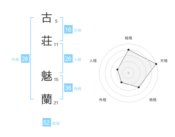 古荘 魅蘭さんの総格は52画の4点!