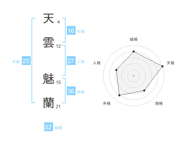 天雲 魅蘭さんの総格は52画の4点!