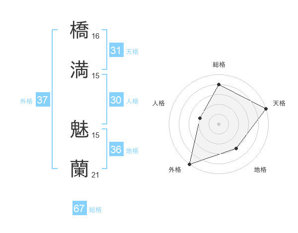 橋満 魅蘭さんの総格は67画の4点!