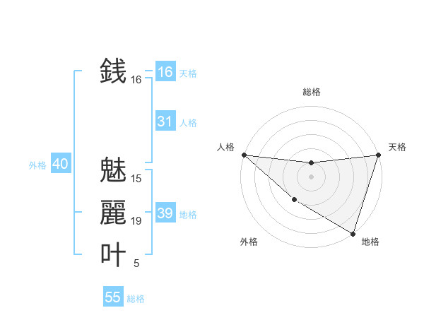 銭 魅麗叶さんを姓名の画数から五運を鑑定