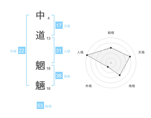 中道 魍魎さんの総格は53画の3点!