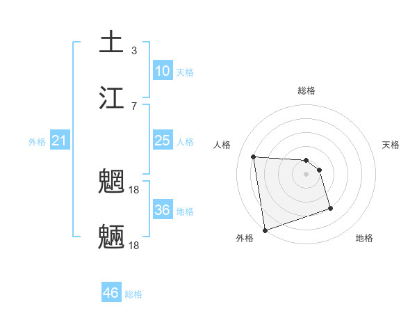 土江 魍魎さんの総格は46画の1点!