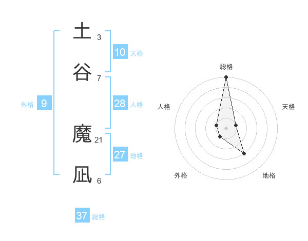 土谷 魔凪さんの総格は37画の5点!