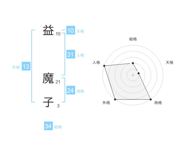 益 魔子さんの総格は34画の2点!