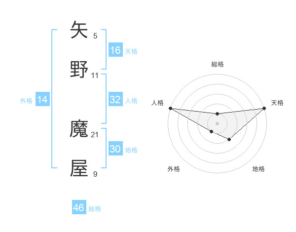 矢野 魔屋さんの総格は46画の1点!