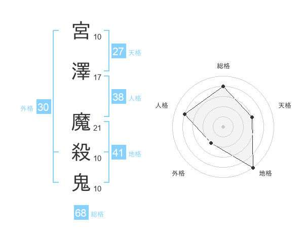 宮澤 魔殺鬼さんの総格は68画の4点!