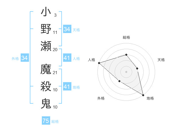 小野瀬 魔殺鬼さんの総格は75画の3点!