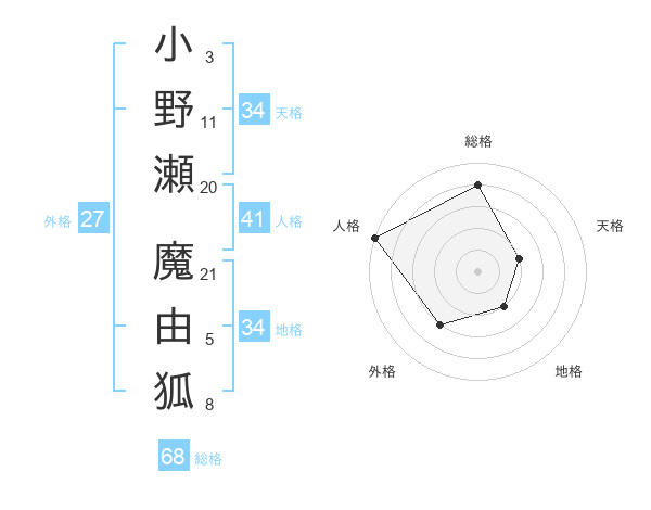 小野瀬 魔由狐さんを姓名の画数から五運を鑑定