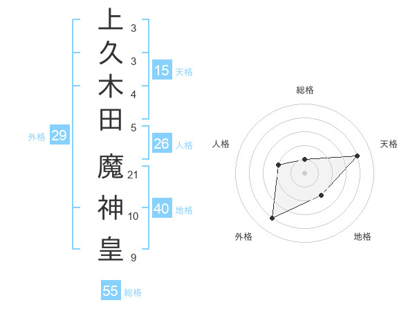 上久木田 魔神皇さんを姓名の画数から五運を鑑定
