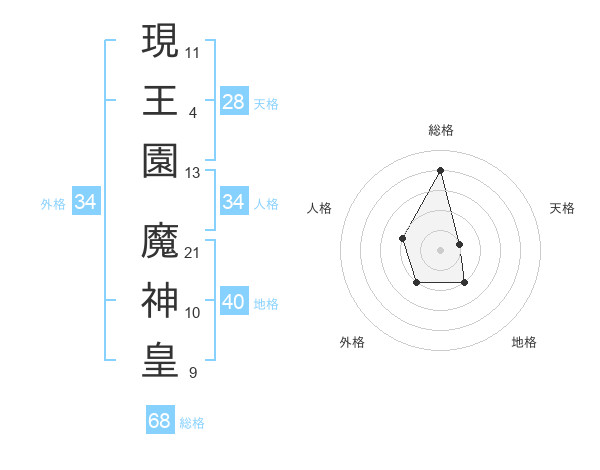 現王園 魔神皇さんを姓名の画数から五運を鑑定