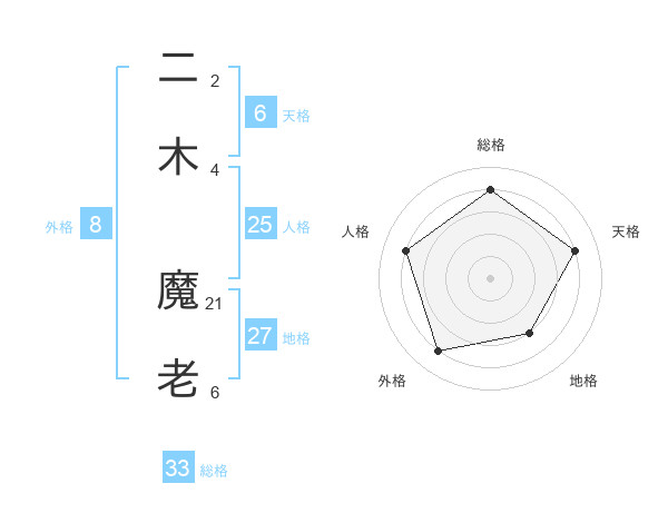 二木 魔老さんの総格は33画の4点!