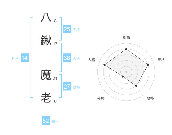 八鍬 魔老さんの総格は52画の4点!