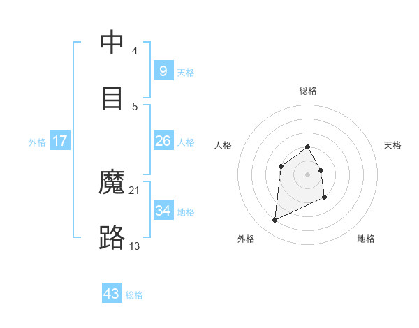 中目 魔路さんの総格は43画の2点!