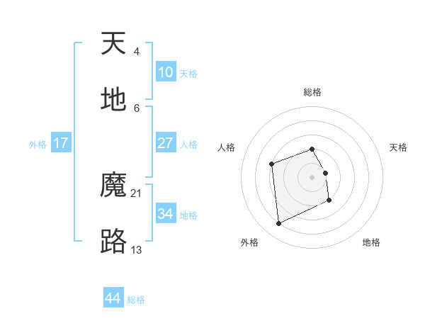天地 魔路さんの総格は44画の2点!