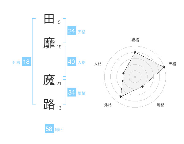 田靡 魔路さんの総格は58画の4点!