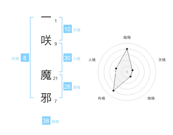 一咲 魔邪さんの総格は38画の4点!