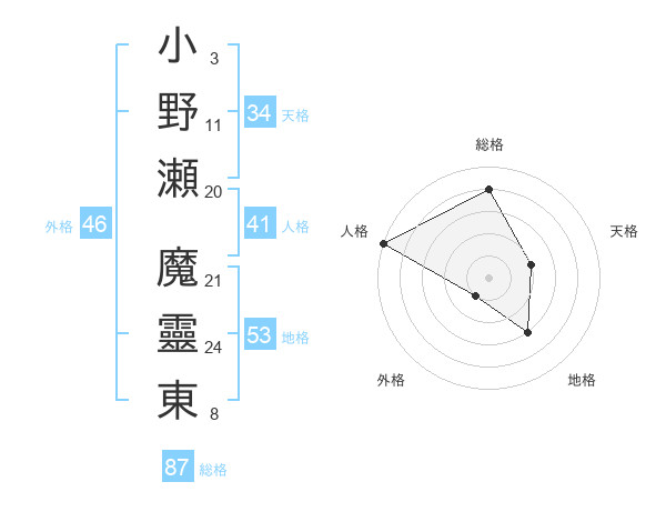 小野瀬 魔靈東さんを姓名の画数から五運を鑑定
