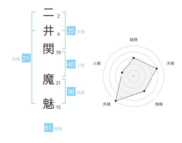 二井関 魔魅さんの総格は61画の3点!