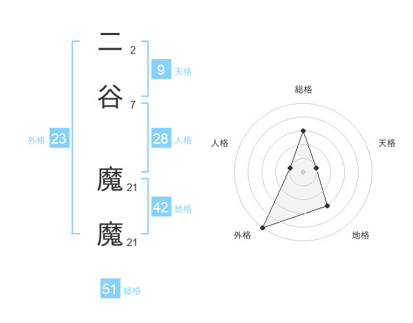 二谷 魔魔さんの総格は51画の3点!