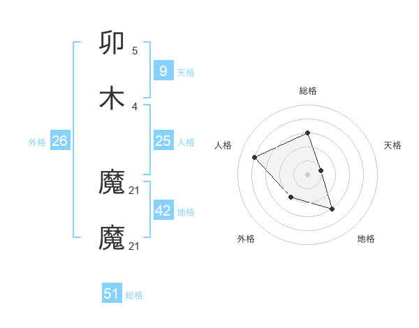 卯木 魔魔さんの総格は51画の3点!
