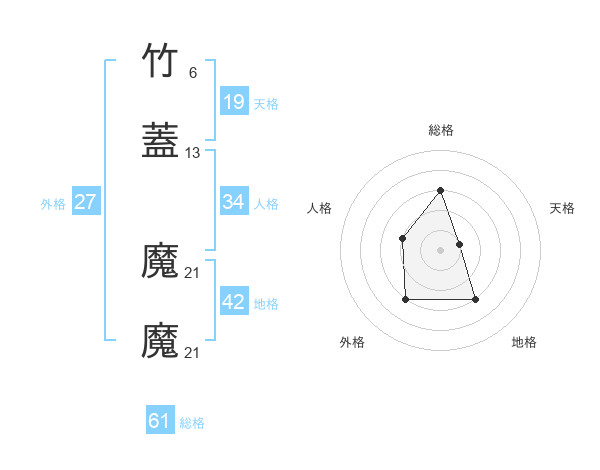 竹蓋 魔魔さんを姓名の画数から五運を鑑定