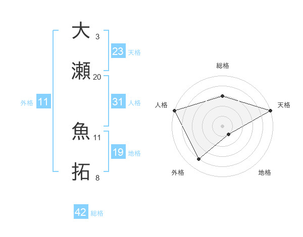 大瀬 魚拓さんを姓名の画数から五運を鑑定