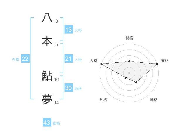 八本 鮎夢さんの総格は43画の2点!