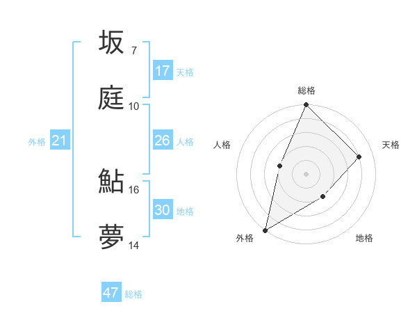 坂庭 鮎夢さんの総格は47画の5点!