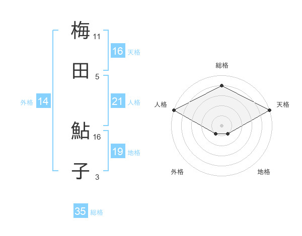 梅田 鮎子さんの天格は16画の5点!