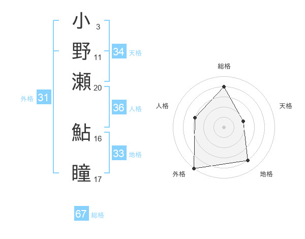小野瀬 鮎瞳さんの総格は67画の4点!