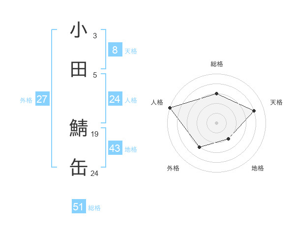 小田 鯖缶さんの総格は51画の3点!