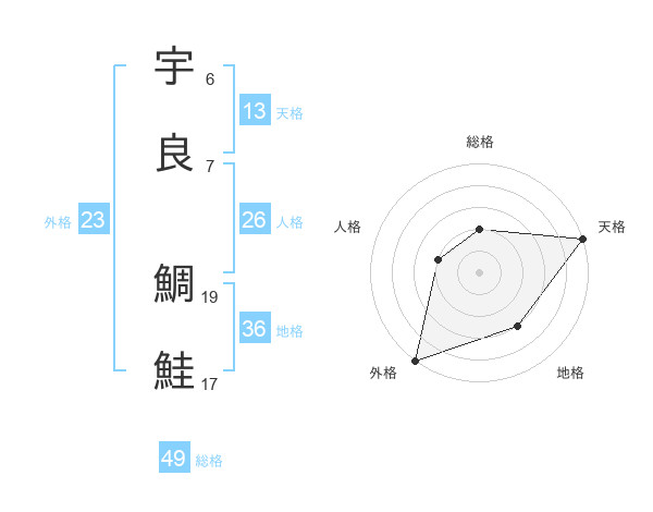 宇良 鯛鮭さんを姓名の画数から五運を鑑定