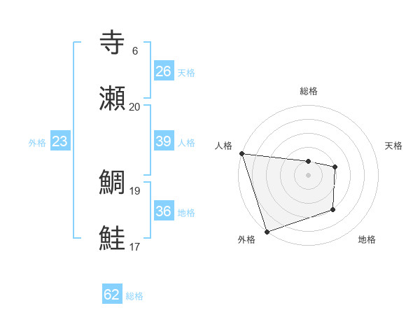 寺瀬 鯛鮭さんの総格は62画の1点!