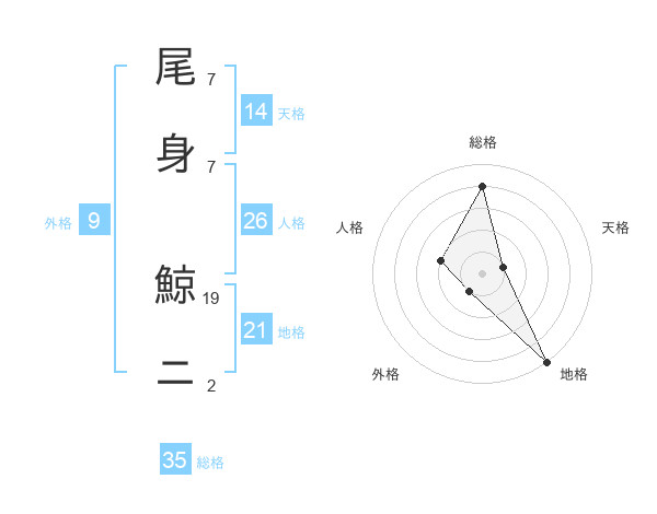 尾身 鯨ニさんを姓名の画数から五運を鑑定
