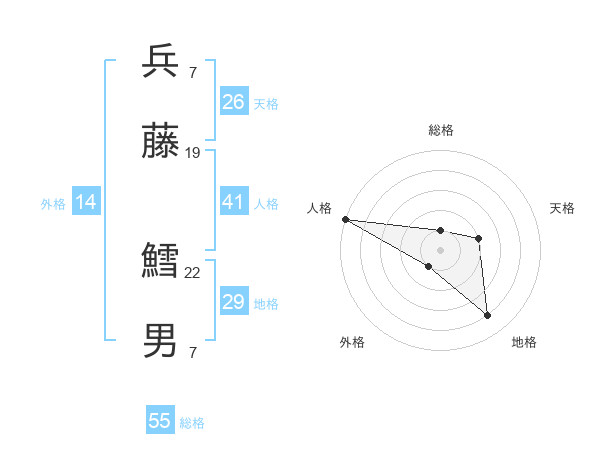 兵藤 鱈男さんの総格は55画の1点!