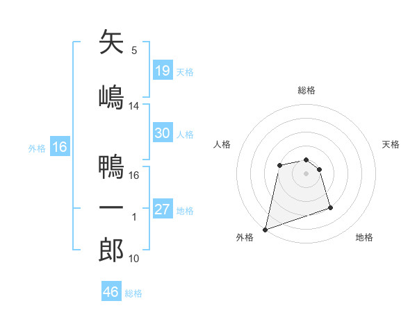 矢嶋 鴨一郎さんの外格は16画の5点!