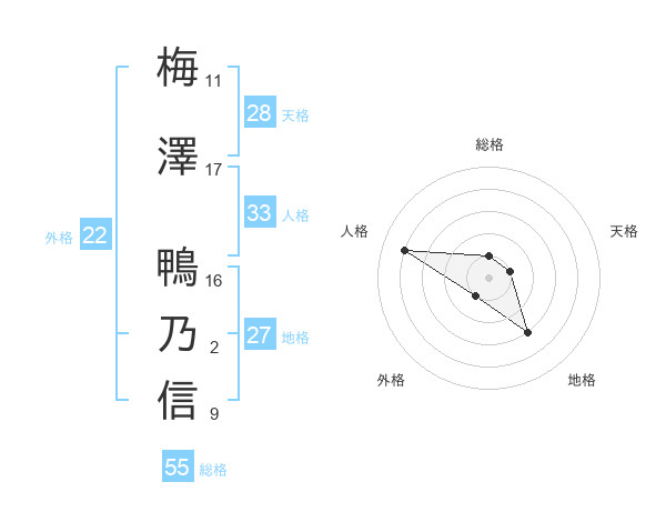 梅澤 鴨乃信さんの総格は55画の1点!