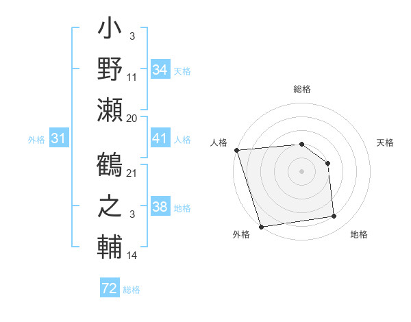 小野瀬 鶴之輔さんの総格は72画の2点!