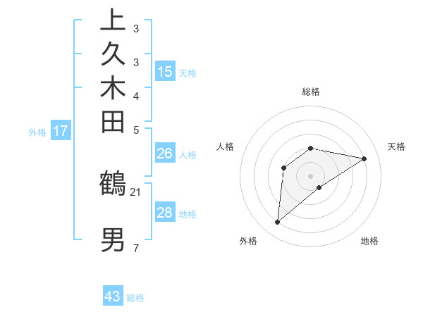 上久木田 鶴男さんを姓名の画数から五運を鑑定