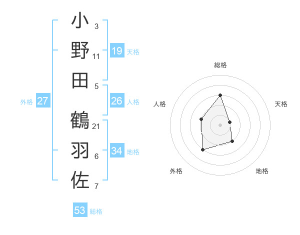 小野田 鶴羽佐さんを姓名の画数から五運を鑑定