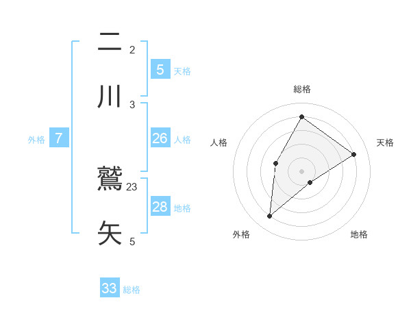 二川 鷲矢さんの総格は33画の4点!