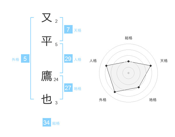 又平 鷹也さんの総格は34画の2点!