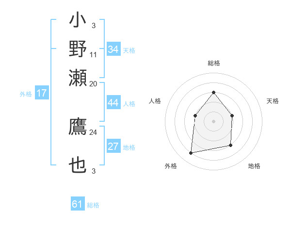 小野瀬 鷹也さんの総格は61画の3点!