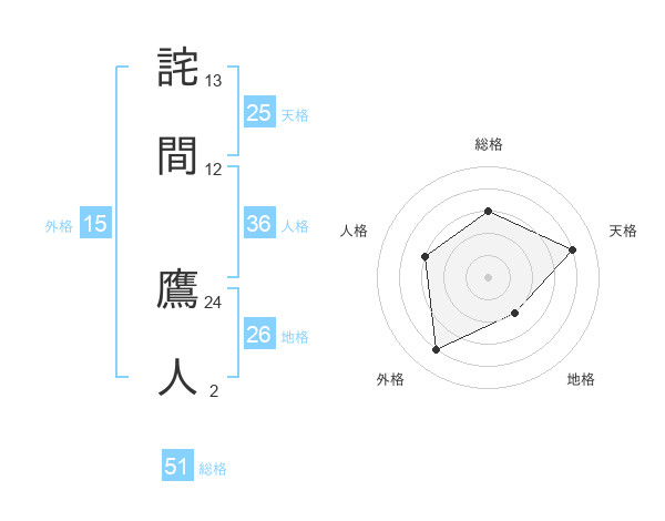 詫間 鷹人さんの総格は51画の3点!