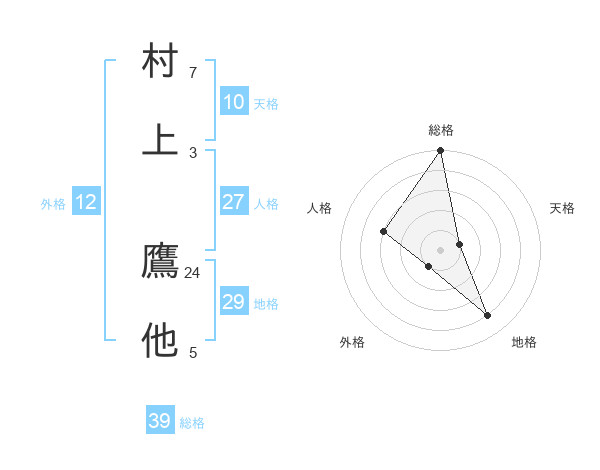村上 鷹他さんの総格は39画の5点