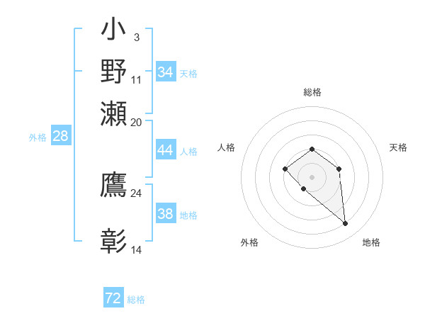 小野瀬 鷹彰さんの総格は72画の2点