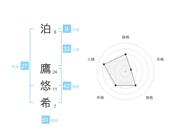泊 鷹悠希さんの総格は51画の3点!